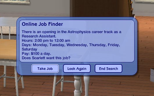 *Important Stuff* - This career contains a custom icon (a comet!) and a unique GUID as well as being EP ready! Now, I'm a history major - ancient warfare to be precise - so the career levels were researched and I tried to be as accurate and realistic as possible, but some of them (Theoretical Theorist) are a little tongue-in-cheek. Let's just say this career is meant to be entertaining ^_^. All 10 levels have chance cards! This means you *can* get fired at level 10! I worked very, very hard on these cards so I really hope you enjoy reading them! The reward is the hydroponic garden .... because I've no idea how to do custom rewards ... otherwise I'd do some sort of telescope ... which makes more sense ... sorry! If anyone can help with this please tell me how to do it!