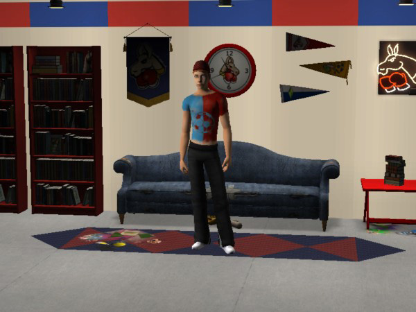 I'm not sure about colleges and universities around the world, but in the US this CAS is very similar to the dormitory rooms and common areas you'd find in a lot of colleges. True to sim form, the fighting llamas are the theme of choice for this set; our student's bedroom has the classic team décor adorning the walls (and the classic student clutter adorning the floor...) and the (well-used) common area is complete with worn couch, bookshelves for studying, and plenty of team spirit!