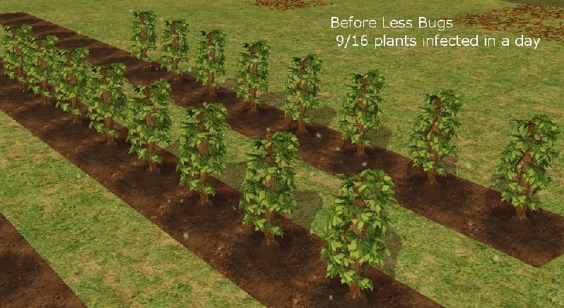 "Less Bugs" lowers the number of new insect infestations in your garden. This is most useful in conjunction with the above "No Spray" hack. Its also good if insects bother you but you don't want to eliminate them completely. Technically it reduces new infections by 3/4, meaning you have about 1/2 to 2/3 less bugs at any given time.