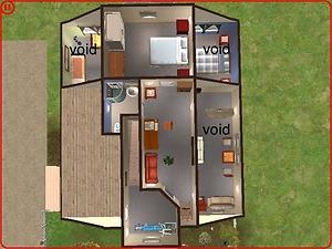There are lots of spaces to partition off should you need extra bedrooms. The bedrooms on the first floor are close to the kitchen and bathroom - should your sims procreate, you can put the parents in the blue room and the baby in the yellow.