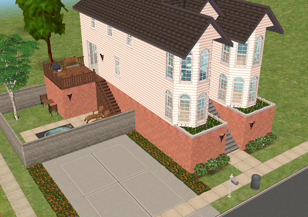 The house is a townhouse with a lot of curb appeal. It has a colonial exterior with brick on the bottom, and white siding on the upper floors. It also has a Victorian design, with its two protruding angled rooms on either side of the double entrance doors. The house is very symmetrically designed, inside and out. It's on a full story of raised foundation that I'm sure a more talented Simmer can turn into a basement. There is a good amount of landscaping done. With the exception of the flowers on the foundation, all of the flowers and shrubs are accessible. There is a nice little deck off the kitchen that leads down to a small grassy area. On the cement patio there is a hot tub. The whole house is great for entertaining. On the first floor is the large, open living area which is connected to the kitchen area, where the dining area is. The second floor has 2 good sized bedrooms, with a guest bathroom and master bathroom. The house is fully furnished. I did the best I could with what Maxis offered, which should be kept in mind! I think I did pretty well considering. I tried to stray from my strictly traditional preferences in furniture and decorations when making this house, so as not to lower the quality by narrowing the potential. The floors are all hardwood, with stone in the kitchen, and tile in the bathrooms. The walls are colorful and different in all rooms, with the main color being a teal / blue. There is a brick wall in the kitchen, as to give the house an authentic colonial quality.