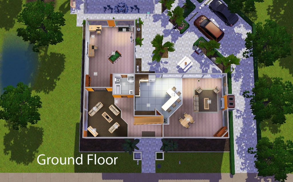 Outside, it has 2 car parks, a fully landscaped backyard with a massive amount of garden space, a full pool and a barbaque area. Note that the front garden needs a little bit of work. There is even a lake for your sims to fish in. Please enjoy and If you have the time, I could use some feedback.