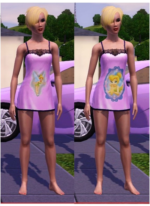 This is the Sims3 chemise colored (in my opinion) "tink pink" (Hex: FFB8FF). It is for Young Adult and Adult Females as sleepwear. The body and straps are still recolorable. I hope that it pleases the Tink fans.