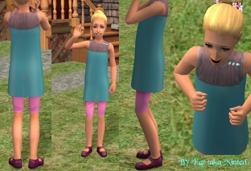 The second is a darker blue and sort of cream pattern, with no leggings or tights, and brown shoes.