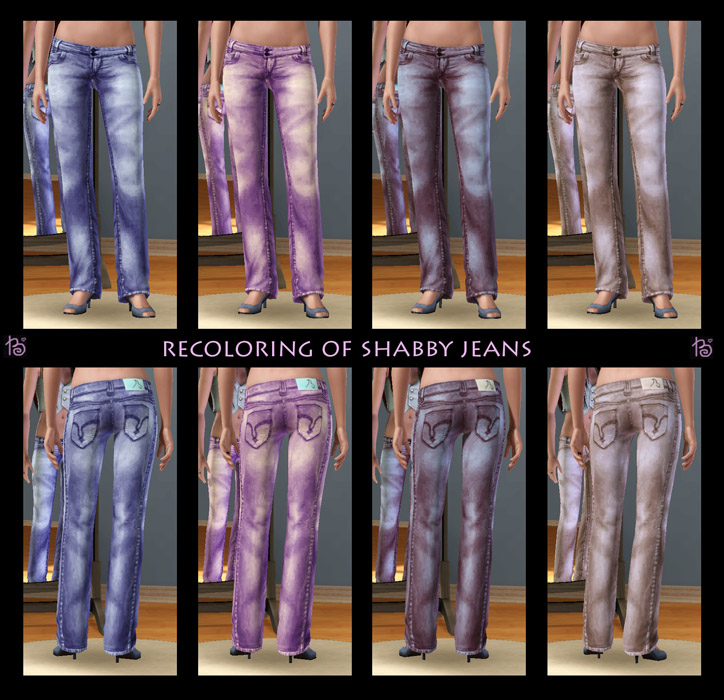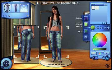 The first type of recoloring - shabby jeans - has 3 recolorable parts: you can recolour a fabric, a label and a shabby sites on a fabric separately))) I also name this recolour "magic" recolour, because layers of a fabric are so fancifully imposed against each other that it is possible to receive thousand unexpected and beautiful shades! I recommend you to make the first color darker than the second for better effect)))