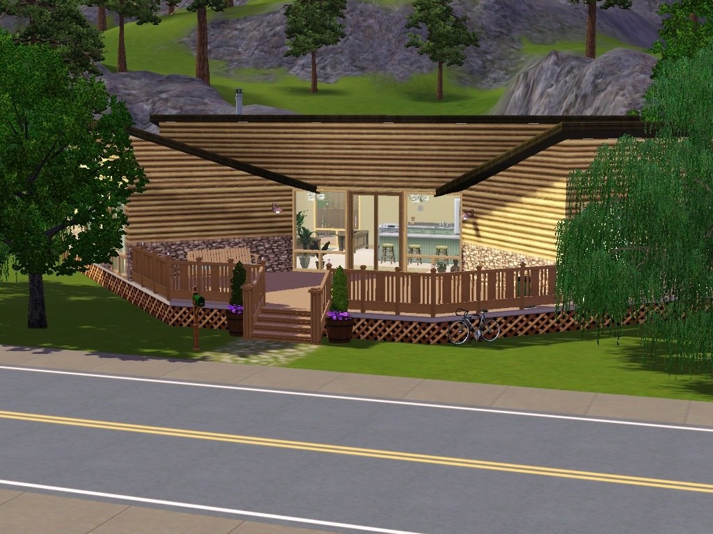 Eco-Lodge for Sims who have shunned technology and prefer live life in the open air. The lodge consists of an open plan living area dominated by a extensive kitchen island, with cosy living area surrounding a log burner.