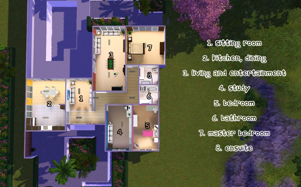 Also, I changed the front a little bit, adding some more plants and a feature pool that matches the one under the roof. There is also 1 or 2 internal walls that I changed. I made the hallway so it connects to the rest of the home, without the need for an arch or a door. Lastly, I changed 2 of the rooms. Instead of the room north of the entry being a study, it is now a sitting room, and instead of the room east of the entry being a bedroom, it is now a study. These are easily changed, but I was furnishing for a specific couple, so thats why I did it. The bedroom is easily changed, the theme is already there. Clouds!