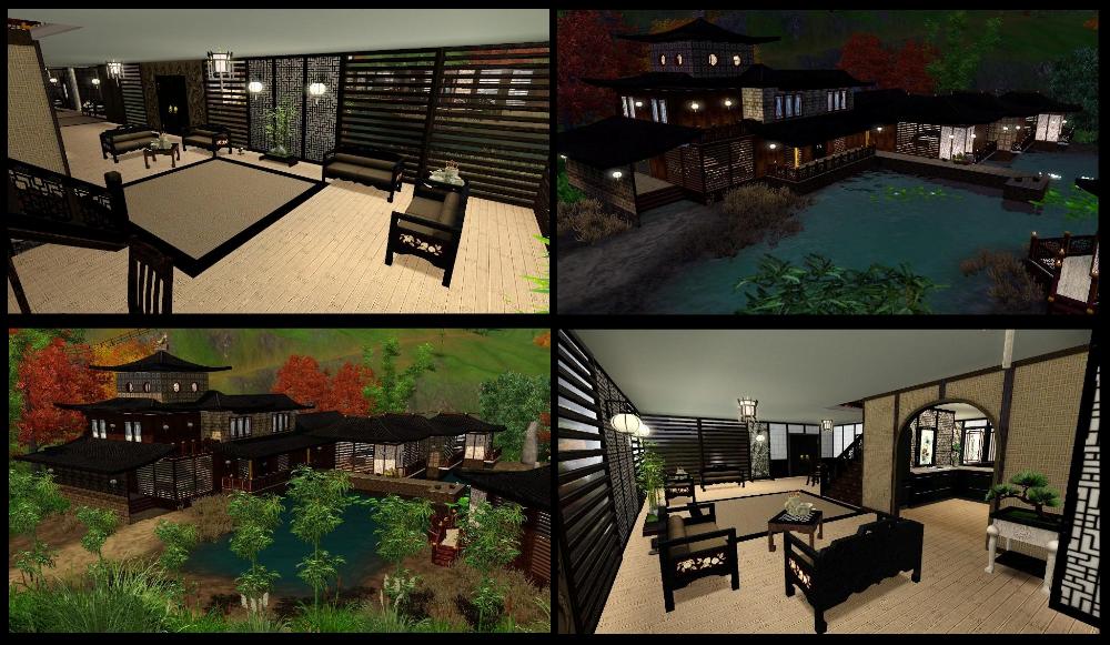 Surrounding the lake are 7 little chinese huts for sims to stay in. Each includes either a double bed or single beds, a bathroom, dresser and TV.
