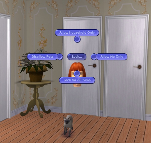 | I made a house that only lets certain sims travel to certain places using pathways and doors. I want the doors to have a lock for all sims except pets, or only allow pets. Is there a way you could allow doors to lock like this? |