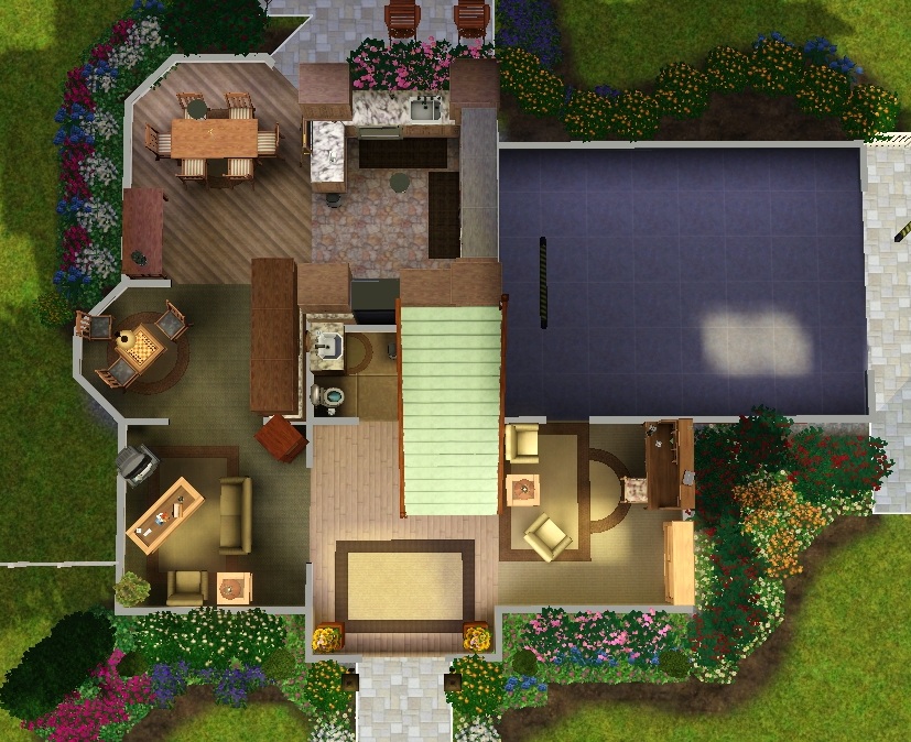 This home was built for my Sims 3 family, so there is a lot of detail included both inside and outside the lot. The home has been play tested (or one sim week), and I have found no problems. Also, let it be know that I avoided misc. expenses that define the level of luxury your sims desire, such as computers, giant T.V.s (there is a small T.V. in the living room), and other electronic devices.