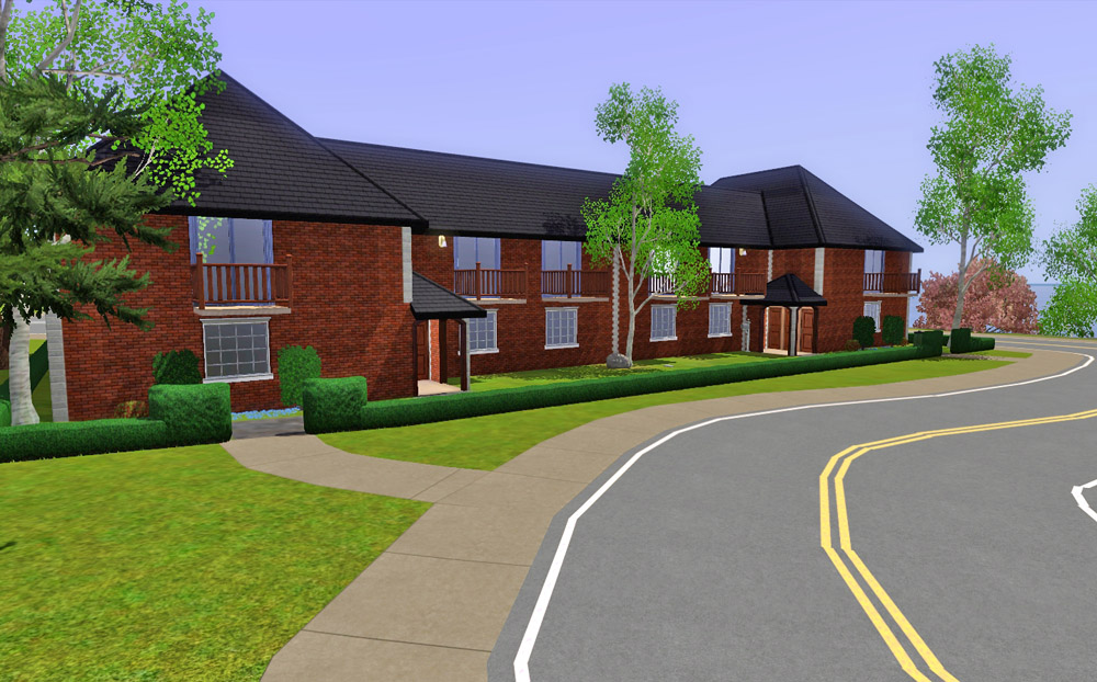 This is an appartment complex lot. The lot contains 8 units, 7 of which are NPC inhabited. The unit that your sims will inhabit is the 3rd unit on the second floor. This unit is a medium sized, single floor appartment. The stairs lead up to a huge living space, with many couches and a huge TV. The Dining Room and kitchen can be entered from this area. The Master Bedroom is sparsely furnatured, but includes everything you need. There is also two "closets" in the room. The smaller room is decorated for a teenaged boy, but can easily changed to fit whomever it may inhabit. There is a desk with computer, two dressers, a boombox, a telephone, and "closet" included with standard bedroom furnature. The bathroom has a toilet, tub, and sink.