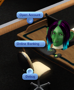 Shows the 'Open Account' interaction & the 'Debug' menu from the computer: (you get 'Open Account' if the interacting sim does not have an account in their inventory)