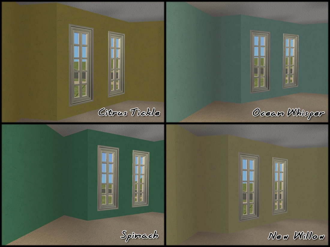 And...Here are two collages of examples of 8 of the colors in-game, on interior walls. Of course, they look much lighter on exterior walls.