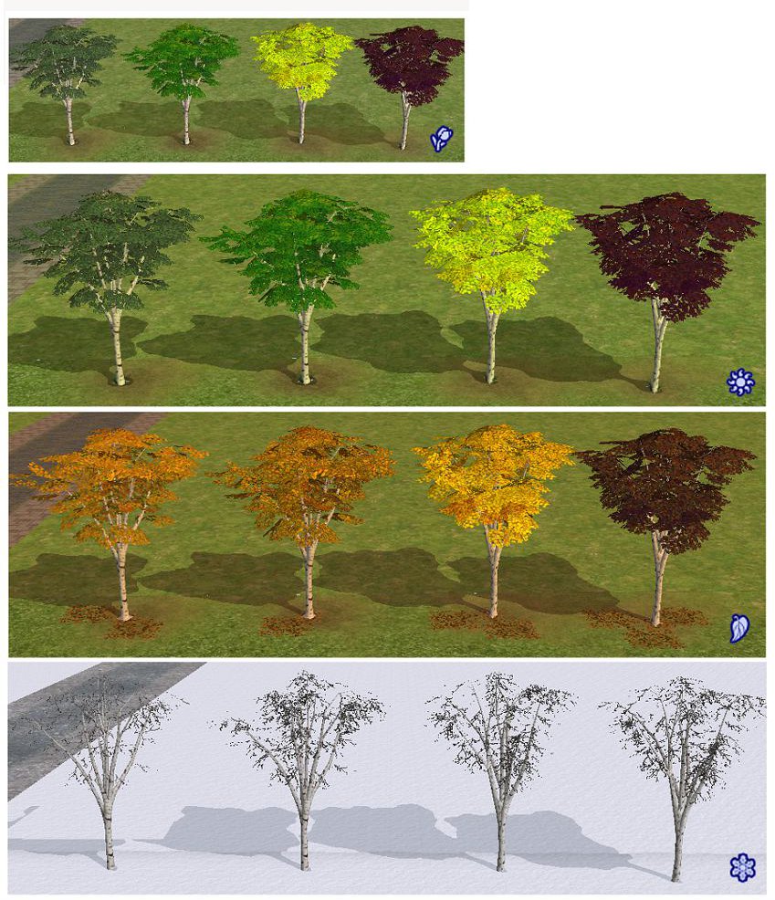 Seasonal Maxis tree recolours and resized trees - willow, midbiscus, Japanese maple, bay tree more...