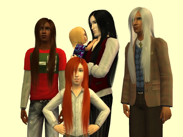 Texures used for these hairs are Remi Sims' maxis match textures. They fit in nicely with the default maxis textures/colors, but have enough shine to also fit in with those who like Nouk and Pooklet textures/colors. Thank you Remi for allowing your textures to be used in others' creations!