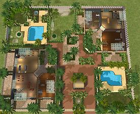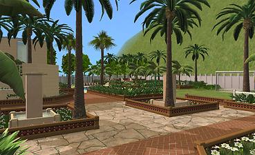 A beautiful house in the middle of an oasis surrounded by Epyptian decorations such as palm trees, flowers, pots and plants, statues and more. more...