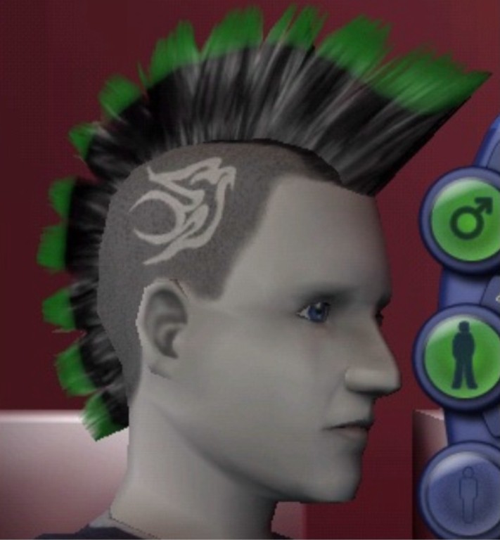 Like it says in the title, it's a green-tipped mohawk with a shaved (bird) design on each side of the head. It's my first attempt at custom content apart from an Iron Maiden T-Shirt that I made for a friend ages ago, and I was just experimenting, so I apologise if it's a bit rubbish. Also, I'm not sure if it will work...this is my first time uploading something...so tell me if it doesn't work, and I'll try to fix it.