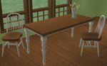 And I did things a bit differently with this set, which is from the base game, so no EPs needed. I was "inspired" by the set that's sitting in my morning room behind me right at this very moment. It served years of hazardous duty as the "school table" when I was homeschooling my brats, and the table's shape is almost exactly like the game's Talking Table. It has a fake-wood top with a white frame and legs. And it has matching Shaker-style chairs with fake-wood seats and white frames, just like the Simple Sit chair. So, that's exactly what I did with this set: The tabletops and chair seats are in wood colors, the rest of the parts in white, like so, with the other colors attached in similar pics: