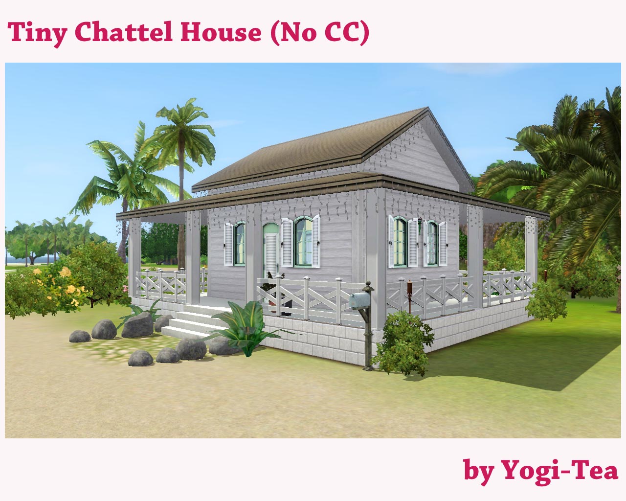 No Custom Content and no Store Items were used to build the house, however, the Tiny Chattel House looks really nice with QBUILDERZ' scalloped roof with white trim and undersides (click the spoiler button below if you want to see the house with the custom roof). If you don't mind custom content in your game you may download the scalloped roof from QBUILDERZ' "Raise the Roof! Then Put Down a Better One!" (roof colour used for the picture: orange).