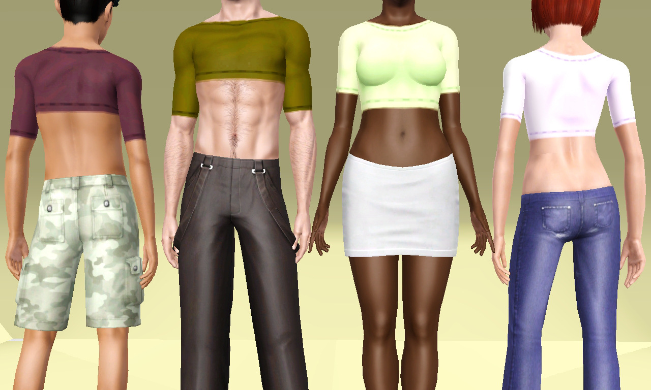 There are 6 styles in each package and the package is a set. There's long sleeved, sleeveless and short sleeved in tucked in and cropped styles. Like my previous shirts these are under the accessory tab and are located in the sock category. I cloned them from the socks, but they will not over write them. The children file is unisex but the male and female files didn't want to cooperate with me in being unisex, so I made them into separate packages that you can pick from. All sets can be in your game with no problem. One issue I've noticed, that's really more annoying than anything, is that sometimes when you pick a style the sim's body will be covered in the material from the neck down. This can be fixed by picking the style again or clicking on another and switching back. It doesn't happen all the time, it seems to be random, but it's annoying and I'm not sure how to make it stop.