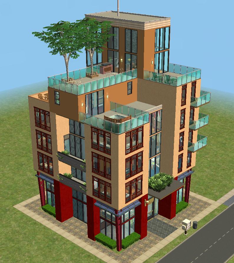 This building is hardly tall enough to qualify as a skyscraper even in the practically height-limited world of TS2, but it is still larger than most 2X2 lots, so on particularly slow computers, be aware of the possibility of greater-than-usual lag time when moving around the lot or saving.