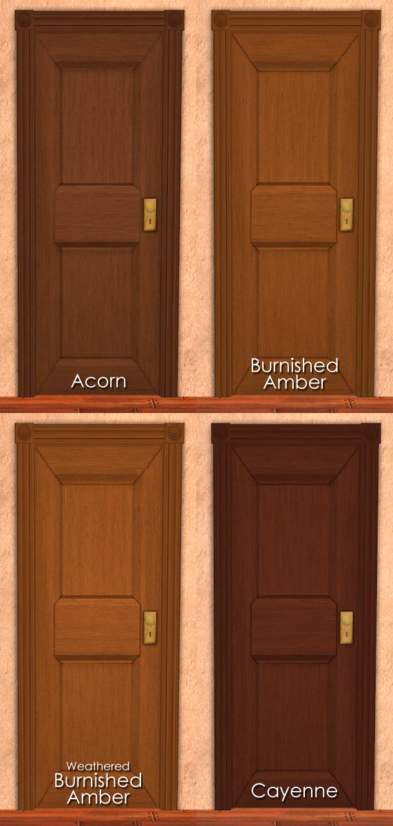 The pics used to make those collages were taken in indoor light with one ceiling light turned on, and I have the Radiance lighting mod. So, bear that in mind, as the colors might look different in your game. And here's one of the colors -- Weathered Cayenne, I think -- in outdoor lighting, should you want to use this as an exterior door: