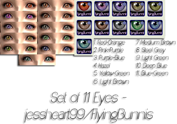 This set of eyes was created in Adobe Photoshop CS6 by me. A list of the 11 colors is above along with the image, though I will include it again below.
