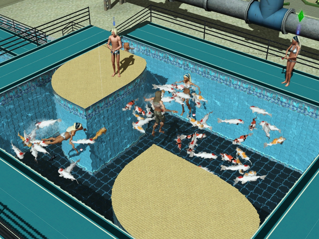 Additionally, all sims (not just children and Insane ones) can use the usual fishing interactions on pools and fountains as long as there is at least one fish spawner in it (You have to click relatively close to the spawner for the interactions to show up though. Sims will NOT fish from a pool or fountain with no spawners in it so just don't place one in any that you don't want them fishing from). The regular Stock Pond interaction can also be used to add fish from a sim's inventory to any pool or fountain to make it fishable from.