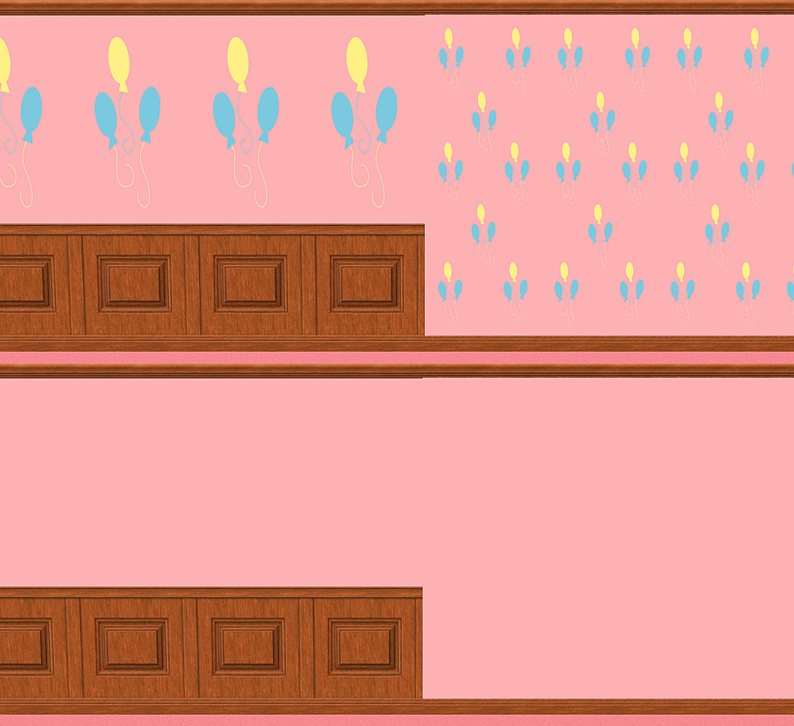 Now, while Pinkie is far from my favorite pony, my favorite color IS pink, so I started with her. There are 3 different stripe patterns in Pinkie's colors, with wainscoting as an option as well. These are located in Wallpapers and are 4 Simoleons. There are also 2 cutie mark patterned walls which, when paired with the 2 "Blank Flank" walls, can appear as decals! Or if you want Pinkie Pie balloons plastered all over your walls, that's fine too! XD These ones are located in Paint walls, the Cutie Mark walls are 5 Simoleons and the "Blank Flank" walls are 3 Simoleons.