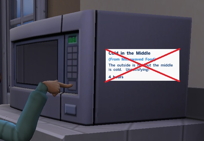 Remember the SimmerChar stove from The Sims 3 and how it sometimes left you with an "Uneven Cooking" moodlet? The microwaves are even worse. They always give you the "Cold in the Middle" moodlet, unless you build up your Handiness to upgrade them. Even the expensive Omniwaver and Schmapple Micro require you to upgrade them. What a rip-off!