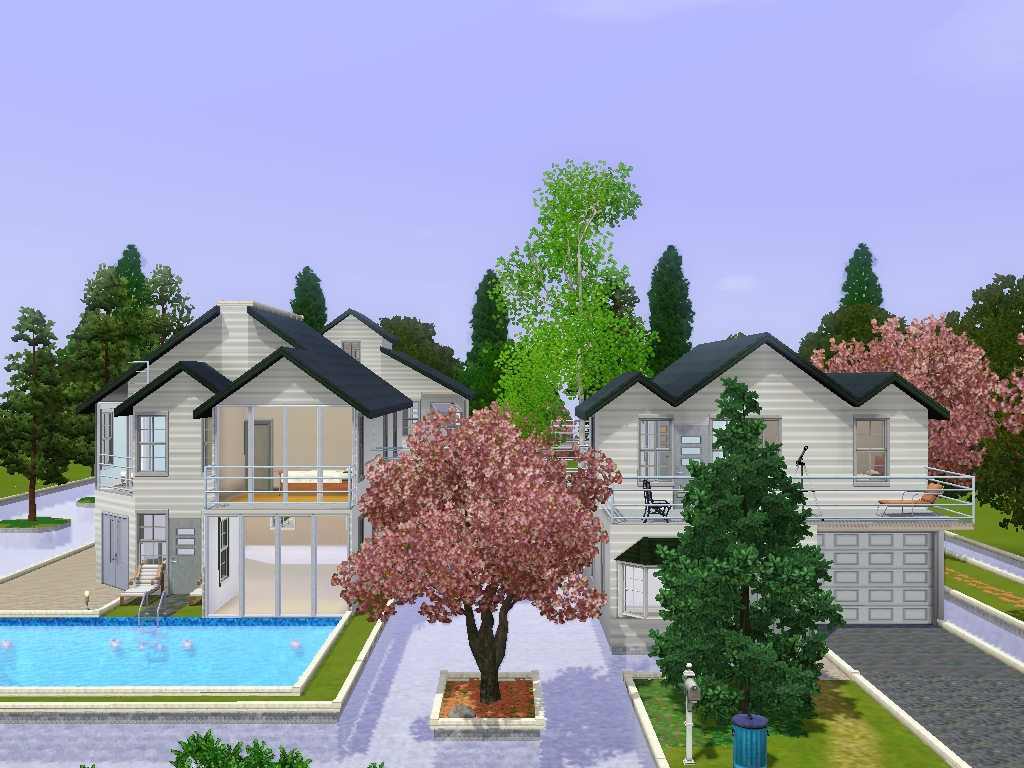 This super residential lot is made of 3 buildings, surrounded by trees, fountains and pools. There is also a private park for your kid Sims including swings, bonfires and a pool in the basement. Other than that, this house includes: