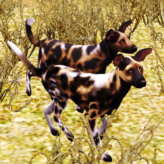 The fur was a "pain-in-the-ass" to create since the pattern looks so random, it was really hard to figure out which colour I should use as base. In the end, both dogs use a different base colour. The markings on the african wild dogs are like our fingerprints, each one is very unique. You can go into the professional fur creating in create a pet and move the spots around to make your own unique fur pattern on the wild dogs. The puppies I got with the two of my dogs on the pictures do look all the same thou xD. You may want to look up some pictures of wild dogs on the internet to get ideas for new patterns. There are really amazing once.