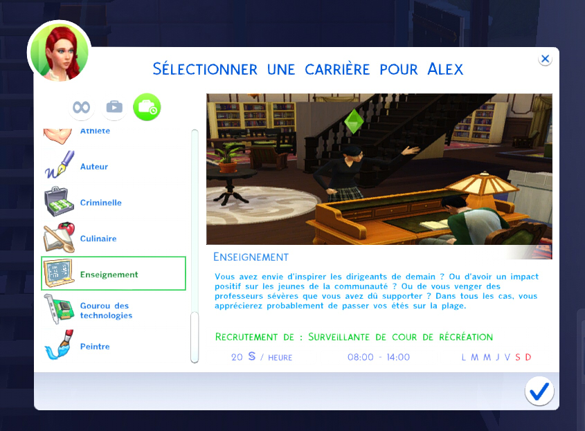 So... This is it ! A custom career for the Sims 4, inspired by the Education career from the Sims 3 Ambitions. The career is for young adult to elder and doesn't have chance card. For now, it's translated to English and French.