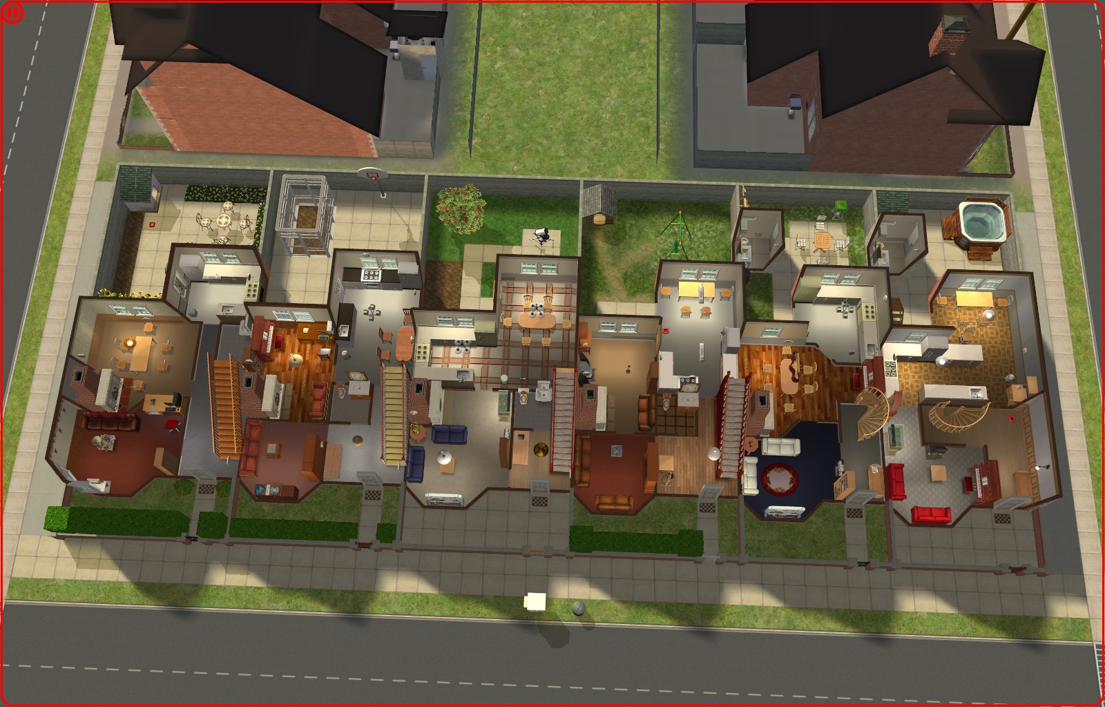 I've made two using the same original 'shell'; one row of 6 houses that is designed for families of up to four Sims, and one row of 6 that has been refurbished into a downstairs 'A' flat and upstairs 'B' flat for single people and young couples (also great for student housing!)