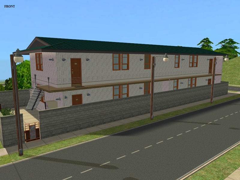 This lot features a small apartment building with four parts. Each bedroom comes with a bed for two (or one if that's how your Sim rolls) and a love seat in the living area. It would fit perfectly in a suburb. Each apartment is a cozy 84-96 sq. Sims squares, which is just enough for a single or couple of Sims and maybe a loyal pet. The apartments cost between $1,275 and $1,414 simoleons. The bottom apartments have larger patios than the top apartments have balconies. I myself have never been to Japan, but feel I know what a Japanese apartment generally looks like, as I have spent many hours on Google Maps looking at the exteriors, and Youtube viewing uploaders' tours of the interiors of their apartments.