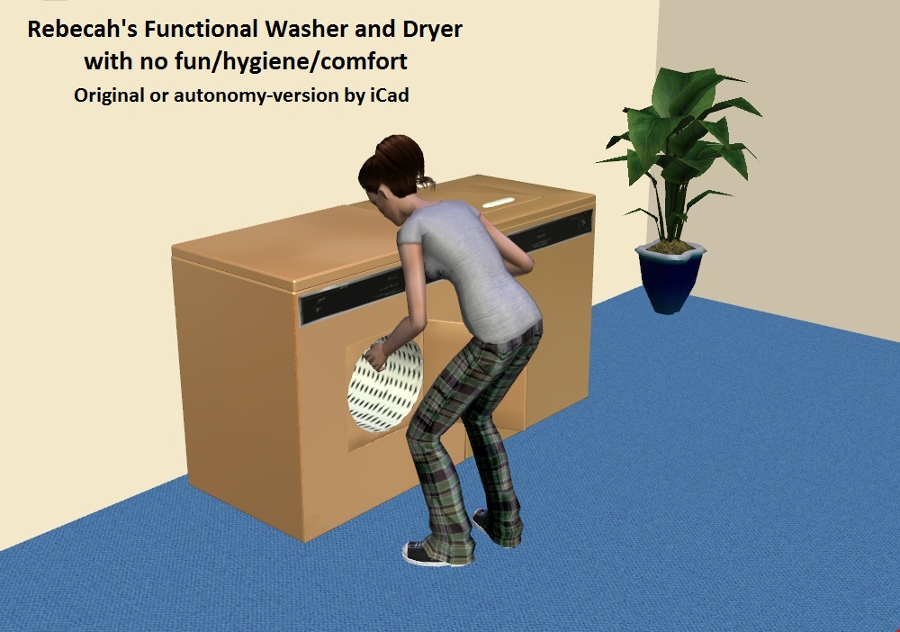 2015-07-27 Added a fourth version. I researched autonomy and realized the object does not need to give fun to advertise fun. This version is autonomous, but Sims do not gain any motives. It uses the same GUID as "RebecahWasherDryer-iCadAutonomy-GummiluttNoMotivesNEWGUID.zip". It is an alternative to that version, but that has the fun removed as well. Only use one.