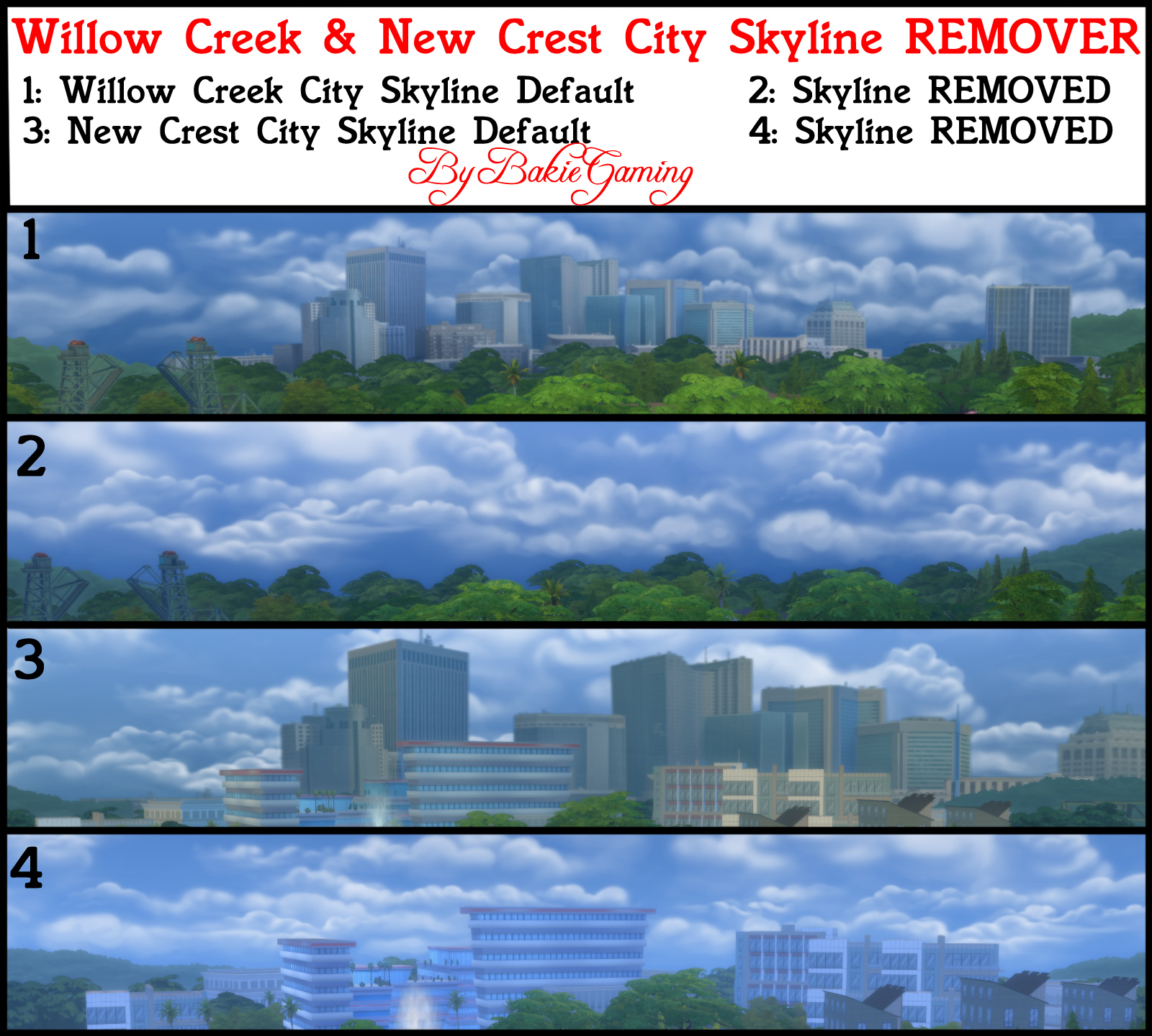 If you want to know where you can find the default City Skylines in Willow Creek and New Crest and how it looks in game when it's removed, please watch my Youtube Video:Bakies The Sims 4 Custom Content: City Skyline Backdrop REMOVER (it's only 1.41 minutes long)