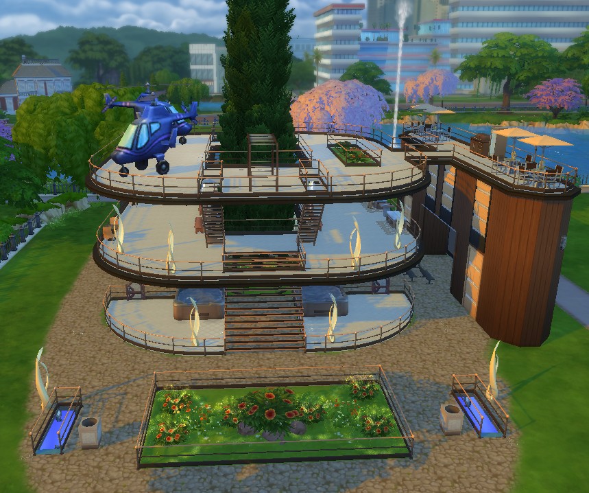 On the lower level of the park, your sims will be able to soak in the jacuzzi, admire the flower bed with fountains, to meditate, to do yoga with an instructor and watch a movie in a small theatre in the open air.