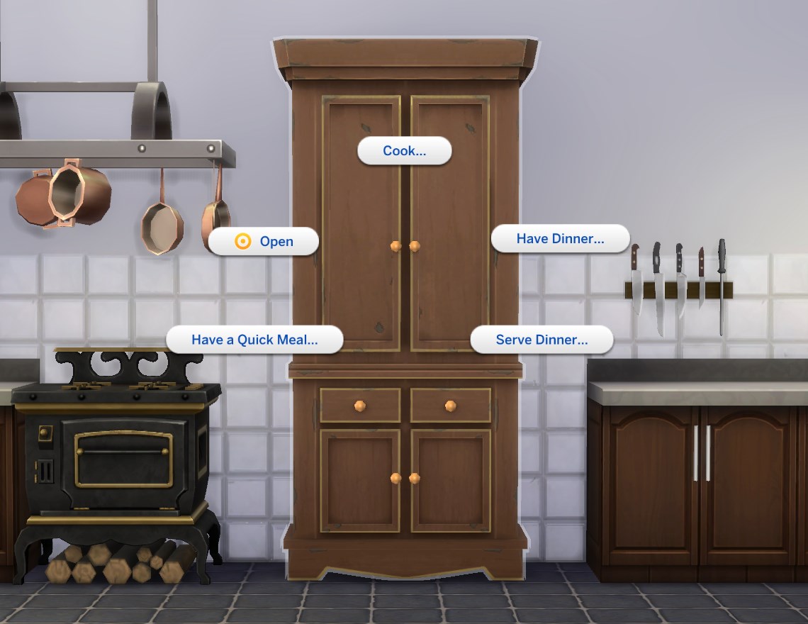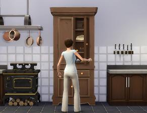 This comes in 12 colour variants, nine from the Maxis “Home is ..” dining hutch and four additional variants that are also in the game files but not used -- those are not particularly exciting (a differently worn grey, another black with different handles, and another dark brown) but when they are already there, why not use them. It costs 680§ like the armoire.