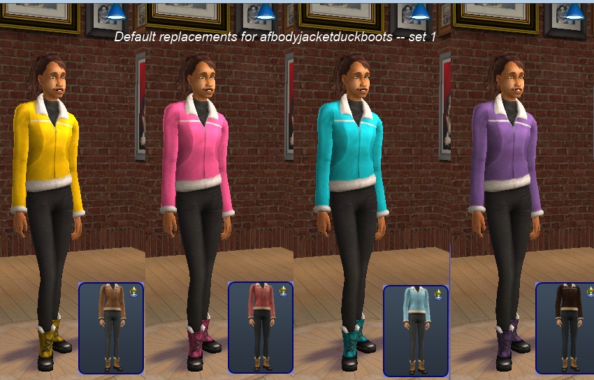 I made two replacement sets, so you can choose which one you want, and can swap them in and out as you like. However, you can only use one at a time, and will need to remove any other replacement for afbodyjacketduckboots before using either of these replacements. Each replacement is in its own rar file.