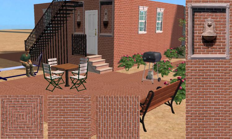 I made this nice light red brick wall. I also made one with a bird bath basin. This set comes with 2 walls and 3 floors. Hope you like them.