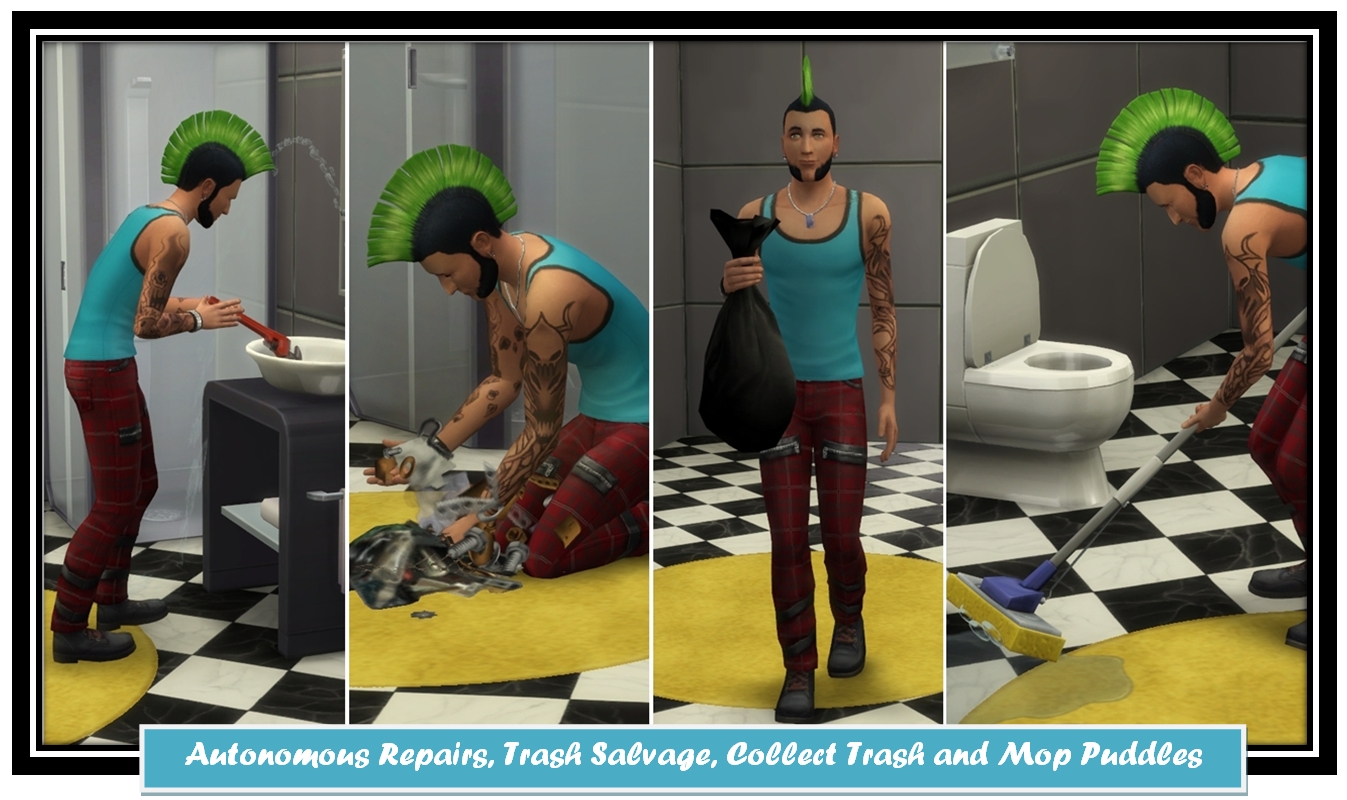 Since the “Updated version of Autonomous Repairs by mrclopes” mod is outdated and doesn’t work anymore i made a tuning mod which overrides the interaction for repairing (+expert repairing) objects, scavenge in trash, collecting trash and mopping puddles which makes all those interactions autonomous.
