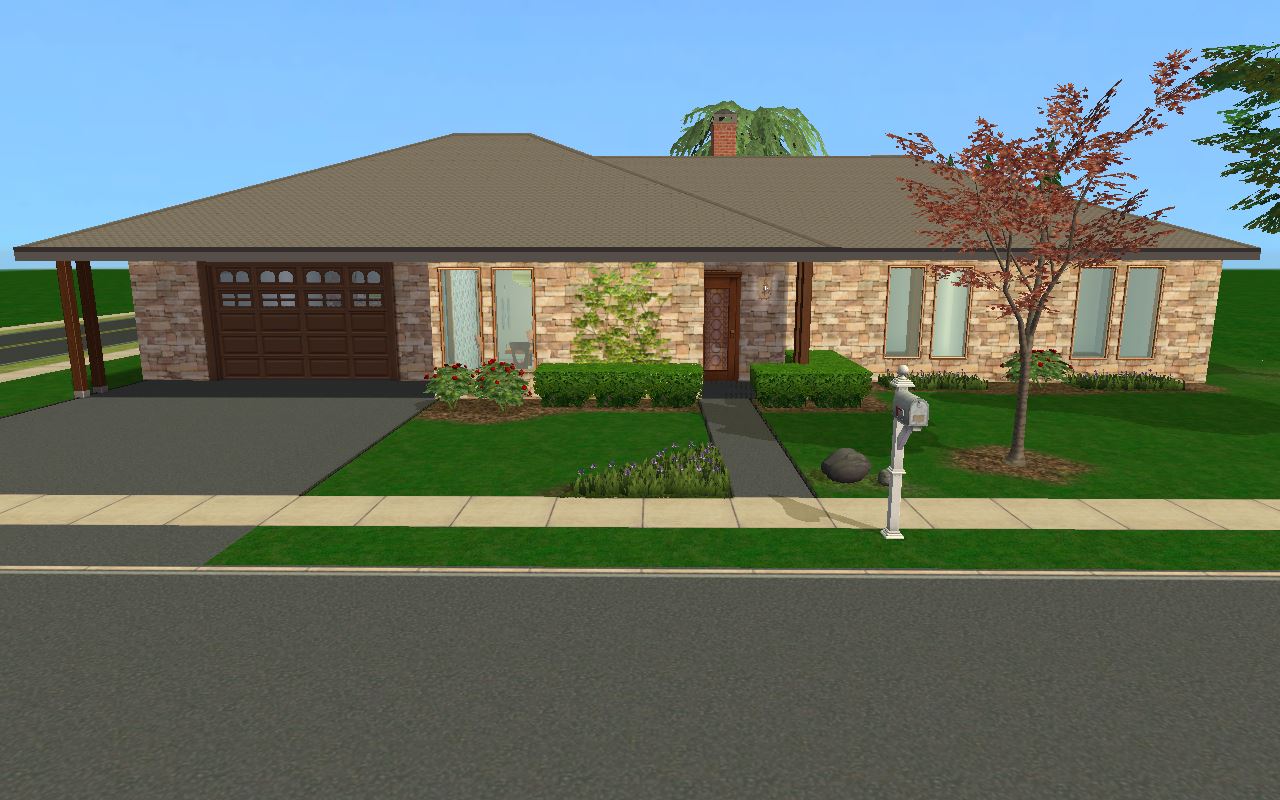 All said, I designed another MidCentury-style ranch. This time, I decided to make a smaller home on a smaller lot (3x3). I think the more compact footprint is still quite livable. This home features: