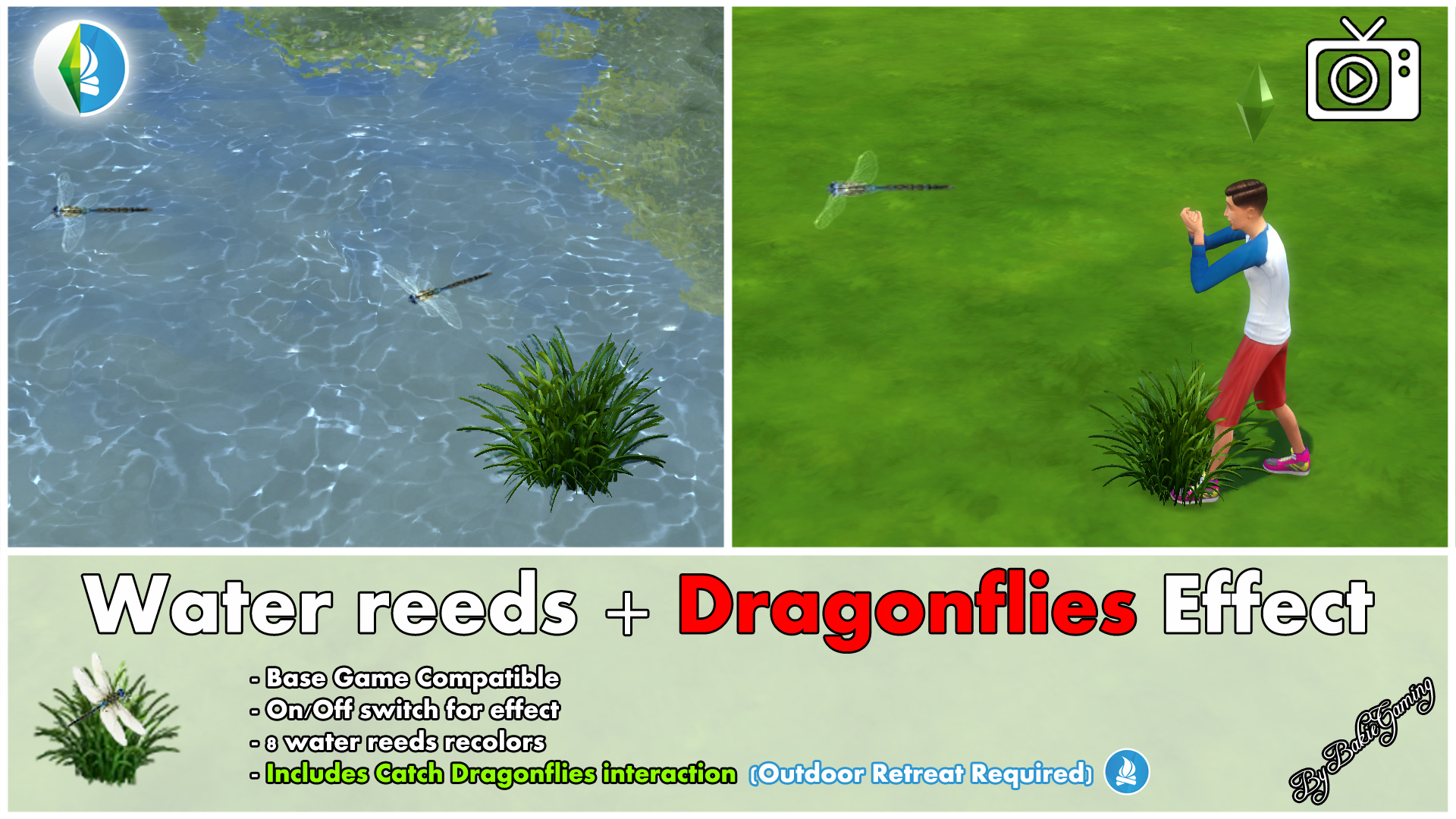If you want to see the effect and interaction added to this object, get some more info and see some tips and tricks on how to use this item, please watch my Youtube Video:Bakies The Sims 4 Custom Content: Water reeds + Dragonflies effect (it's only 4:14 minutes long)