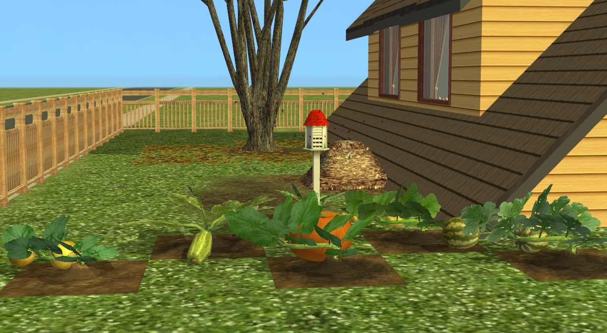 If your Sim has no gardening badges, they can only grow one crop - Courgettes/(zucchini). With a bronze gardening badge, two extra crops become available - Vegetable Marrows and Butternut Squash. With a silver gardening badge, the last three crops become available as well - Melons, Pumpkins and Watermelons. The crops need to be planted, watered, tended, sprayed and harvested, just like the EAxis originals. The harvested crops can be used to stock the refrigerator for fresh food points, or sold. You can actually also stock the juicer with them, but there is no point - no juice can be made without a custom juicer.