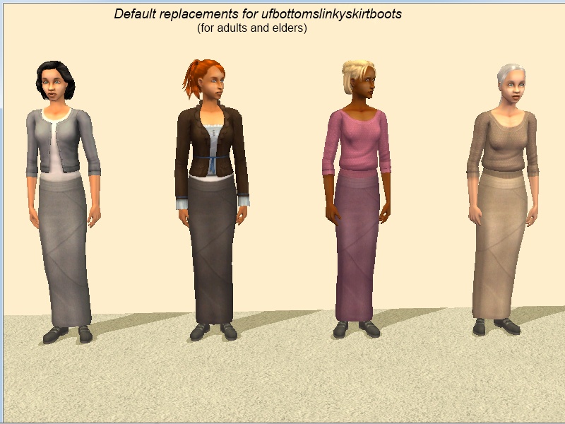 You can use these packages with my elder-only replacements, but they will need to load before the elder-only packages. You should be able to use these packages with any other default for fbottomslinkyskirtboots that only replaces the adult or elder skirts. Of course, if you are using separate defaults for the AF and EF skirts, you will need to remove one of them before using these packages.