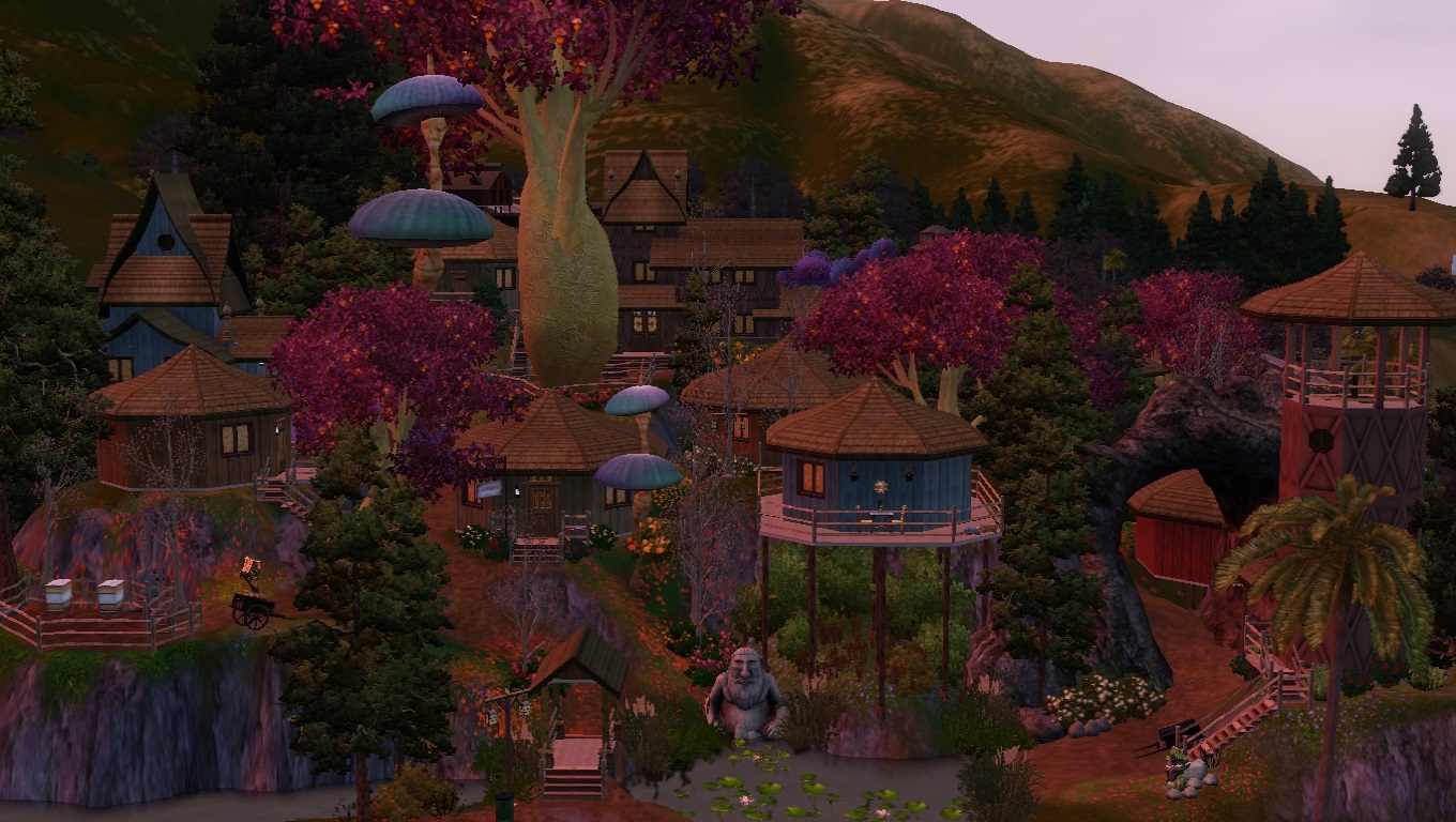 The village consists of five small houses, each built with all the basic necessities a sim needs to live including a kitchen, bed, and full bathroom. There are two "merchant shops" in the village, one being an alchemy shop where fairies can mix and "sell" potions and elixirs to the rest of the village, and the other being a gemstone shop where they can polish, display, and "sell" any gemstones they find. There is a communal meeting house at the top of the hill, where the population can come together to hear speeches and talk about daily events in town, and a crafting cottage, where they can go to paint, sculpt, and be creative. The great Acacia tree that the village was built around sits in a garden in front of the crafting cottage.