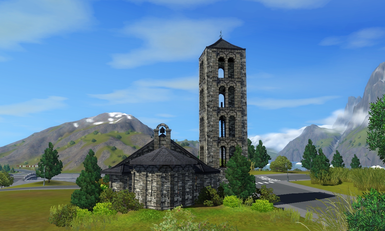 Some of these Pyrenean churches are also famous for their frescoes, so my Sims 3 version includes parts of the Sant Climent de Taüll's frescoes (considered one of the masterpices of European Romanesque) in the central apse.