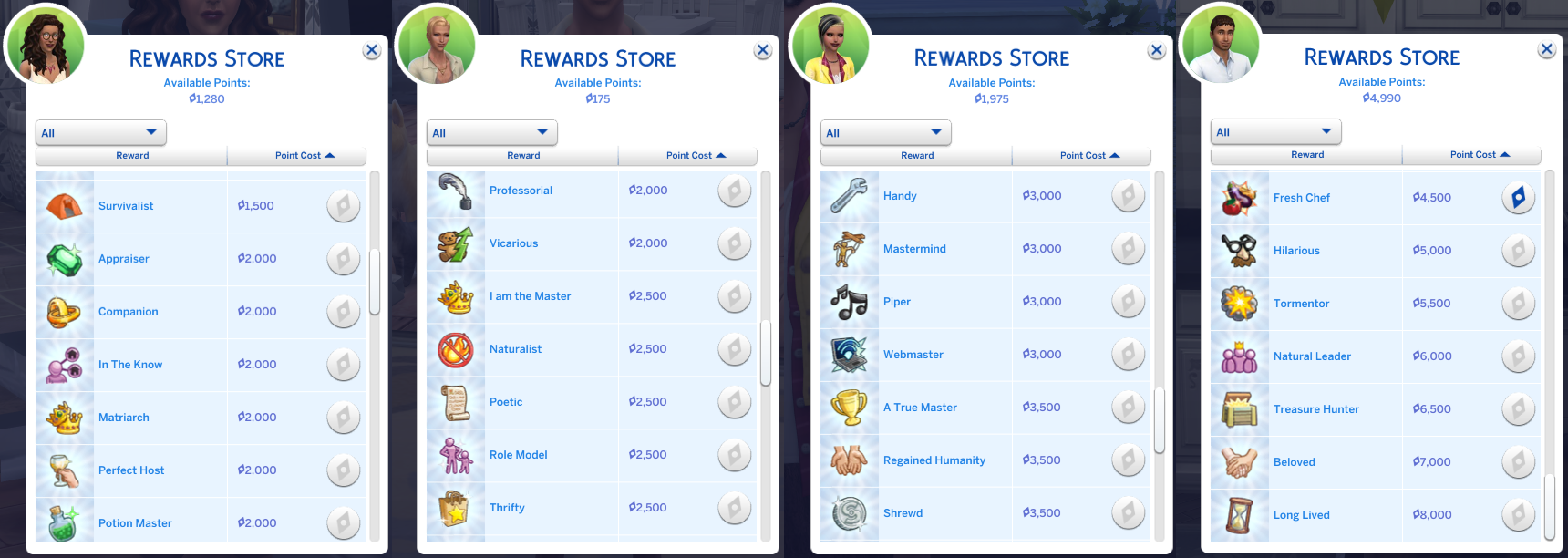 - Mostly because I felt they had a more powerful effect. Also, I set the prices of the Aspiration reward traits to roughly match the EA prices for default reward traits - which range from 500 to 10000 satisfaction points. If my prices are too high, try the Half Price, Quarter Price, or Free flavours.