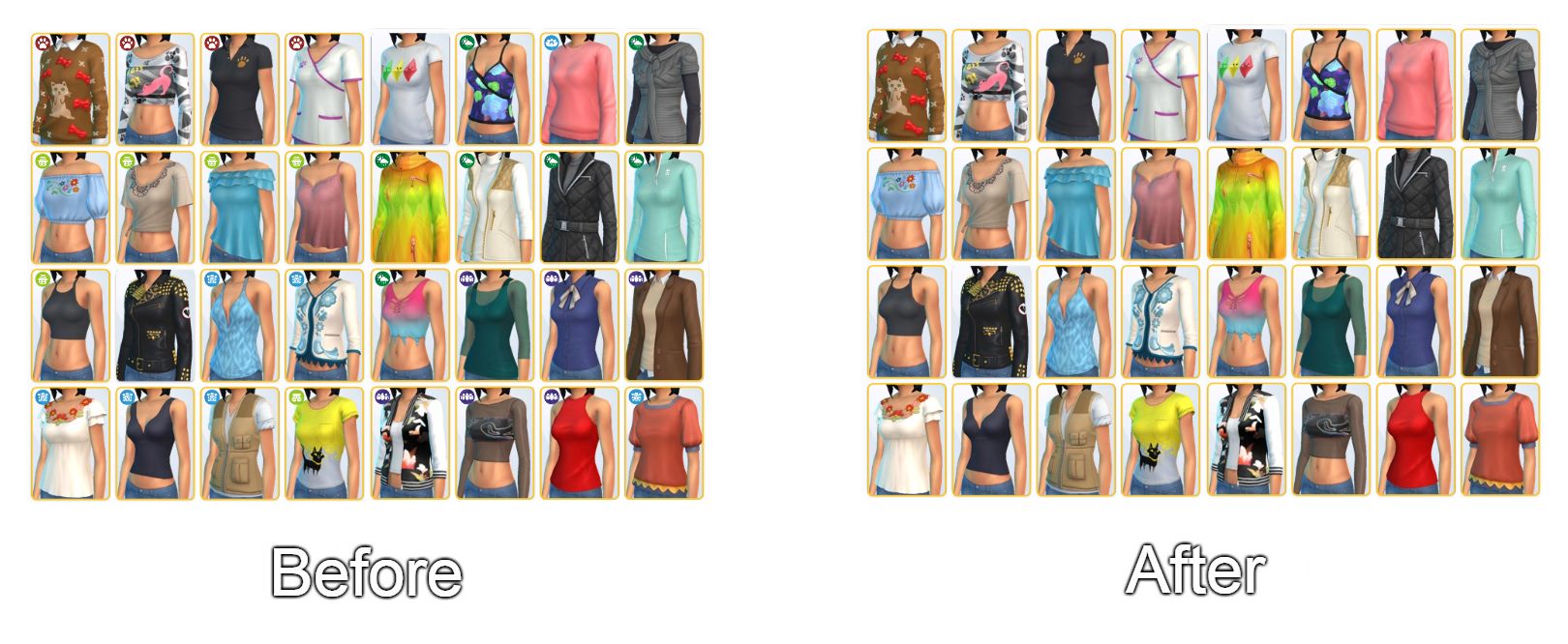 This mod will conflict with any Mods which override DST Image resources (Group 00000000, various instances, appear in ClientDeltaBuild6, ClientDeltaBuild7 and ClientDeltaBuild8 .package files in The Sims 4 > Data > Client (not in Documents)). These resources have two versions: 1.1kB and 4.1kB both of which are needed for this mod to work. The resources with pack icons are the only resources modified by this mod, the rest can be safely modified without any conflicts.